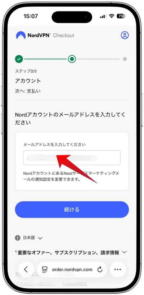 メールアドレスを入力し、「続ける」をタップして次のステップに進みます。
