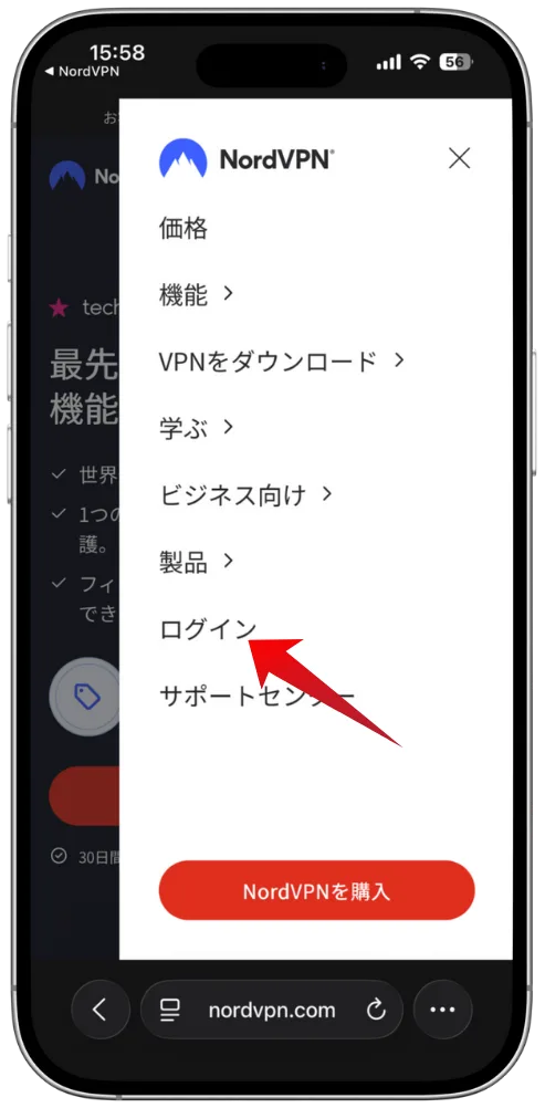 NordVPN公式サイトの上部にある「ログイン」から、契約時に登録したメールアドレスとパスワードでご自身の「Nord Account」にログインします。