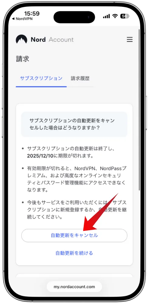 サブクスリプションの自動更新キャンセル画面が表示されます。