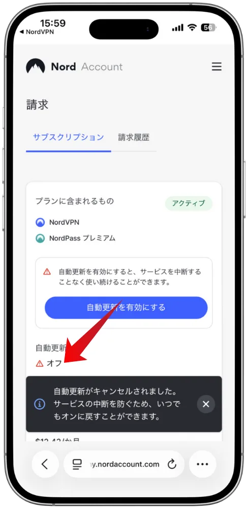 アカウントページで自動更新をオフ