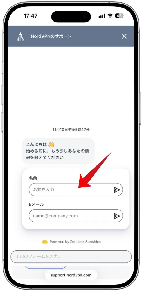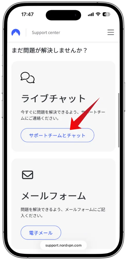 「サポートチームとチャット」をタップして、ライブチャットを開始します。